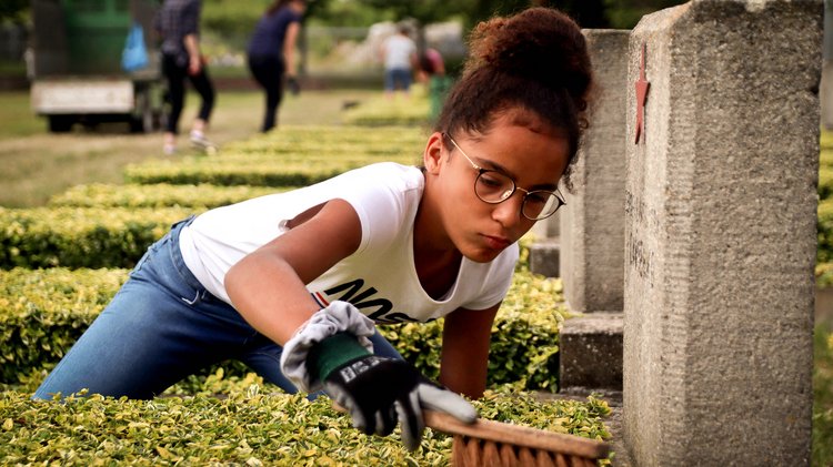 Junge Frau reinigt den Grabstein eines sowjetischen Soldaten (Bild: Volksbund Deutsche Kriegsgräberfürsorge e. V.)